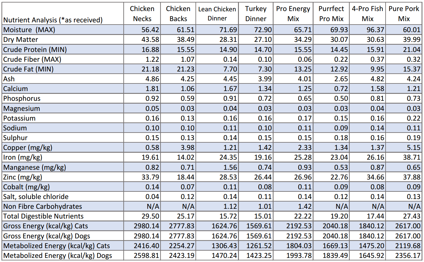 - Ground chicken bone in, pacific coast salmon, cooked eggs, pork organs.