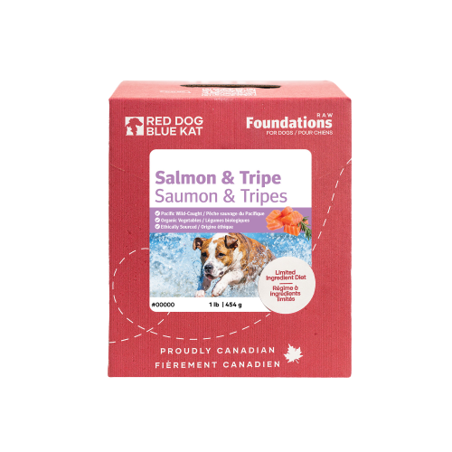 Salmon, Tripe and Veggie meals are made from wild caught pacific whole salmon, beef tripe, beef organs and organic vegetables. Although the combination of salmon and tripe is an offensive smell to humans, it’s incredibly nutritious for your dog!